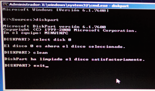 - Teclear el comando EXIT para salir del DISKPART y cerrar la ventana.